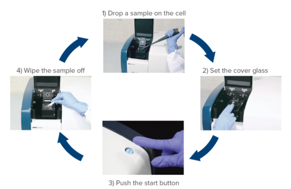 Nesse sistema, uma única gota de aproximadamente 5 µL é depositada diretamente na célula de medição a partir de uma pipeta, permitindo medições rápidas e reprodutíveis com preparo mínimo da amostra. Essa abordagem reduz significativamente o consumo de material e facilita a análise sequencial de múltiplas amostras.