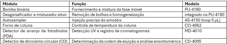 O estudo utilizou o sistema modular de HPLC da Jasco, composto pelos seguintes módulos: