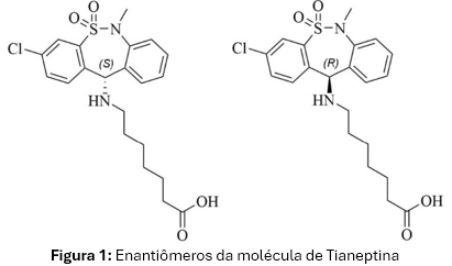 A depressão é um dos transtornos neurobiológicos mais comuns no mundo, afetando concentração, energia, ansiedade e humor. Antidepressivos tricíclicos, como imipramina e amitriptilina, são eficazes, mas apresentam toxicidade cardiovascular significativa. A Tianeptina, um antidepressivo tricíclico com estrutura distinta (núcleo dibenzo-[c,f][1,2]tiazepina S,S-dióxido e cadeia lateral de ácido aminoheptanoico), apresenta meia-vida curta e rápida eliminação, com efeitos cardiovasculares mínimos. Sua molécula possui um carbono quiral, gerando um par de enantiômeros R/S, ainda pouco estudados quanto a diferenças terapêuticas e toxicológicas.