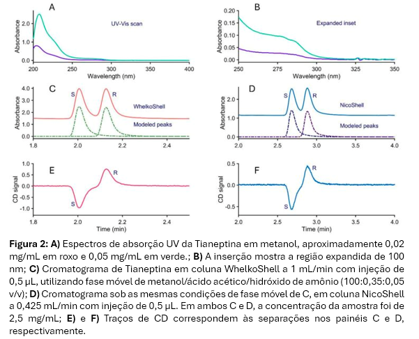 A Tianeptina possui anel heterocíclico de sete membros contendo enxofre e nitrogênio, ligado a uma cadeia lateral de ácido carboxílico de sete carbonos, apresentando um carbono quiral que gera os enantiômeros R e S (Figura 1). Para atribuir a configuração absoluta, os isômeros foram separados por cromatografia preparativa quiral utilizando uma coluna WhelkoShell com fase móvel etanol:hexano 50:50 v/v.